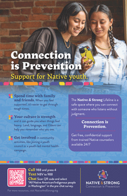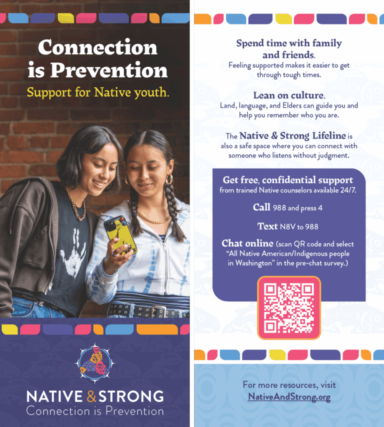 The following assets were developed to help partners and community members across Washington share information about the Native & Strong campaign. Download rack cards, posters, social media graphics, and outreach resources to promote the Native & Strong Lifeline and help connect people to culturally grounded mental health support.